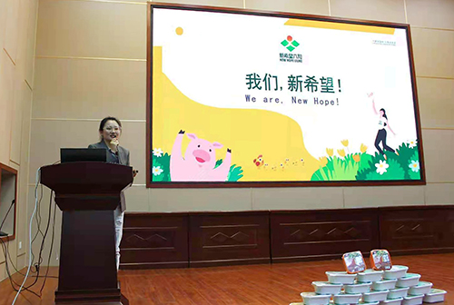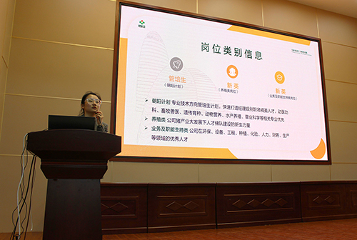 会议伊始,主持人呼雅歌介绍本次会议到场领导及嘉宾。随后,包国荣书记为本次会议致词,他围绕着“思想解放”、“围墙理论”、“大学生未来就业方向”三方面进行具体讲解,他表示大学是一个增强学习技能,培养学习能力的平台,我们正值信息技术时代,同学们应改善生活方式及学习方法,增强驾驭知识的能力、开拓思维打破陈旧观念,同时应该明确自己的职业生涯规划,树立清晰的目标,并为自己的目标努力奋斗。随后,新希望纵队蒙东战区总经理何树旺结合个人职业生涯经历,围绕“毕业时期”、“就业初期”、“任职期间”三方面具体分析,他表示推动社会进步发展的力量主要来源于企业和学校,企业是将理论知识转变为实践能力的重要平台。期间,何总经理从企业整体养殖情况、企业发展趋势及未来愿景介绍公司概况。人力资源经理苏一凡通过宣传短片全面展示公司整体布局状况、奋斗历程、业务板块、战略目标及在建项目等方面,同时详细介绍本次招聘信息、薪资待遇、面试流程及企业管理方案,让同学们对新希望六和股份有限公司有了更进一步了解。会议最后,有意向同学提出问题,人力资源经理苏一凡为同学们耐心解答。