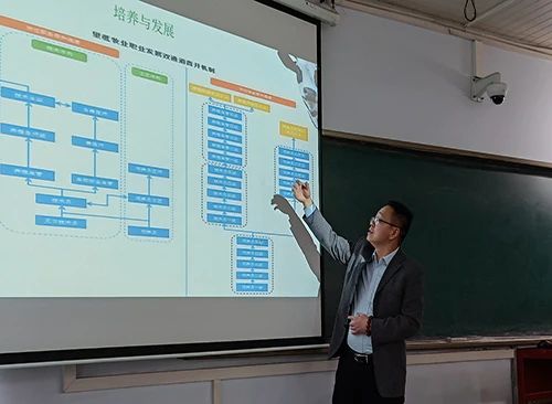 会议伊始,钱小平首先介绍了内蒙古量蕴牧业发展有限公司的概况,让学生对公司具有初步了解。随后,钱小平从招聘需求、工作环境、薪资待遇等方面展开介绍。期间,钱小平具体介绍了该公司猪生态循环全产业链项目与肉羊养殖基地。会议中,他围绕着行业的选择、产业链人才培养和管理、职位的晋升空间和成长机制、员工福利等方面为同学们讲解职业发展平台,提到公司能够为同学们提供优越的工作条件。会议最后,钱小平为同学们介绍本次招聘信息,并为同学们解答疑惑。