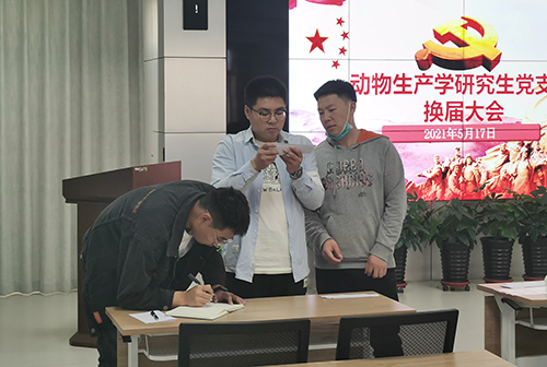 会议伊始,主持人介绍了本次会议的流程,并对党支部工作进行总结,全面总结回顾了支部的自身建设、活动开展等情况,并提出存在的问题和对下一届支委的建议,全体党员表示一致认可。随后,主持人宣读换届选举规定,被选举人依次进行自我介绍,党员根据被选人的平时表现情况及工作态度发表意见,并投票选举。期间,主持人公布选举结果,新一届支部委员会委员由青林担任党支部书记、董琛琳担任副书记、毛金菊担任组织委员、郭世伟担任宣传兼纪检委员。会议最后,全体参会人员宣读入党誓词,主持人对新一届支部工作提出了要求,希望新一届支部紧紧围绕学院党建发展开展工作,积极探索有效的切入点,做好完善党支部工作制度、改善支部思想建设、改进党员管理方式、创新支部活动方式等方面的工作,构建加强研究生党支部建设的长效机制。