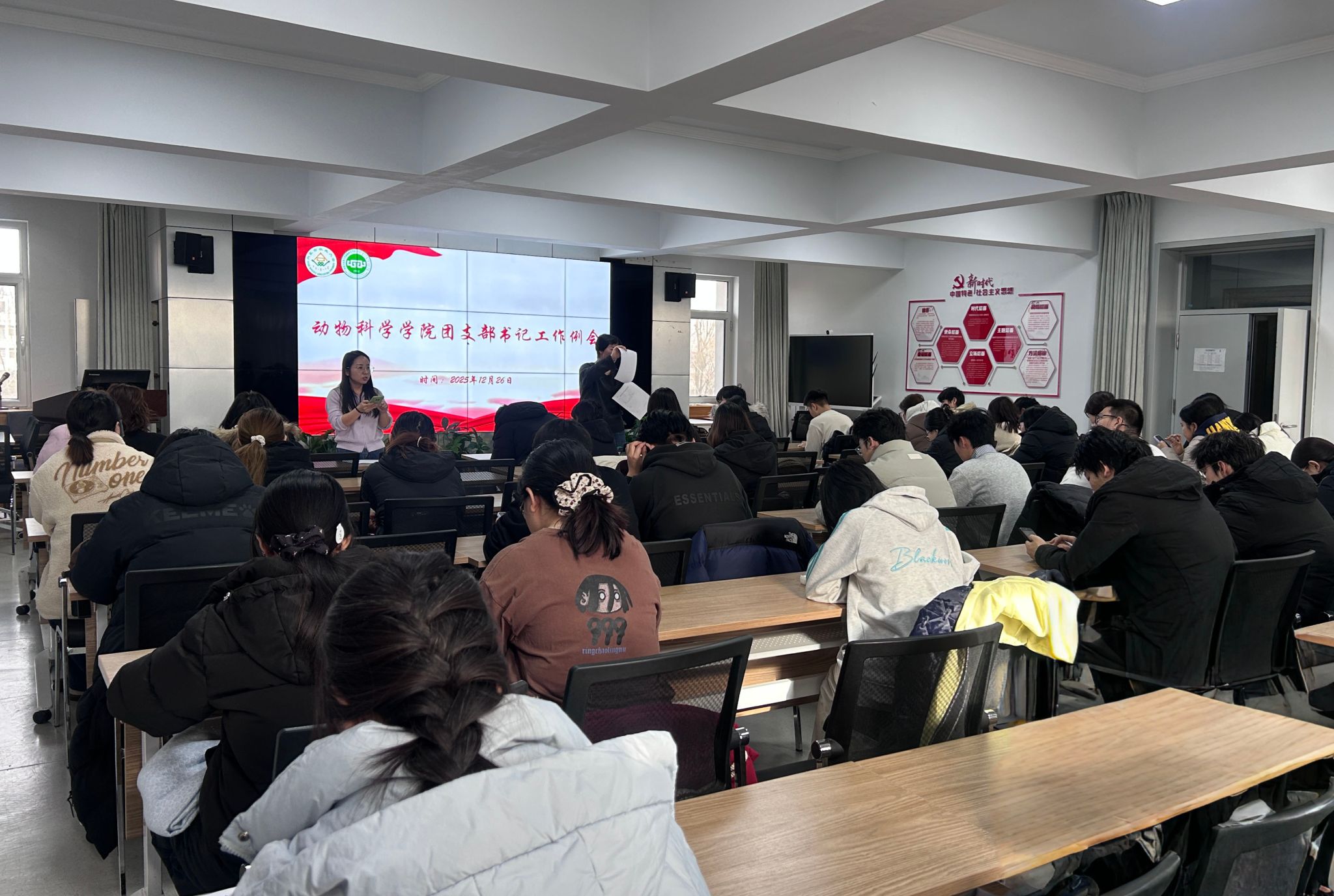 其力格尔表明本次会议旨在明确团支部书记的职责定位,强化其作为团组织联系青年学生的桥梁纽带作用。随后,马丽娜对劳动教育和寒假社会实践活动作出具体安排,明确劳动教育需立足专业特色、社会实践劳动等内容分层推进,促进学生深入理解国情、增长才干、服务社会。期间,其力格尔强调要严肃考风考纪,团支书应引导同学树立“诚信考试”理念,营造风清气正的考试氛围。同时,其力格尔强调,“智慧团建”信息录入务必精准无误并动态更新,团员教育评议须确保公平公正。最后,其力格尔提出通过深化活动形式改革、开展基层活动评比来激发组织活力,并规划2026年团员发展的目标方向,为必赢中心共青团工作的高质量发展奠定坚实基础。