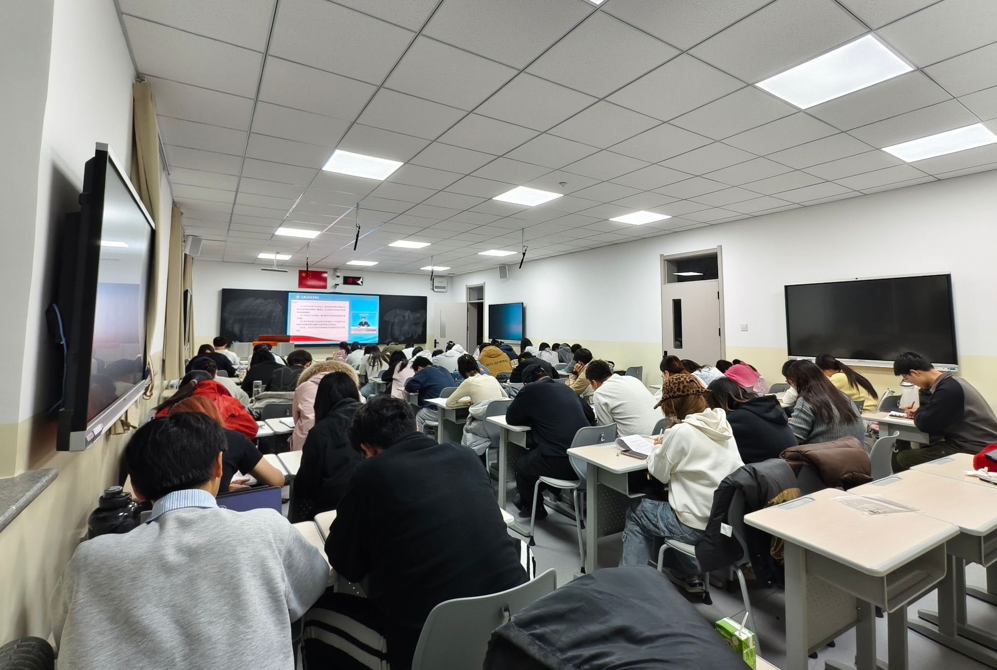 林卓岩说明本次课程旨在引导预备党员深入学习贯彻习近平总书记关于加强和改进民族工作的重要思想,准确把握铸牢中华民族共同体意识的核心要义。随后,林卓岩为全体预备党员播放王延中研究员关于“中国特色解决民族问题正确道路与铸牢中华民族共同体意识”的专题讲座视频,视频围绕道路探索、民族工作成就、铸牢中华民族共同体意识的重大意义和重点任务四大板块,结合理论阐释与实践案例,生动解读了民族团结对于国家统一与民族复兴的深远价值。期间,全体预备党员认真记录、积极思考,展现出浓厚的学习热情和强烈的责任意识。